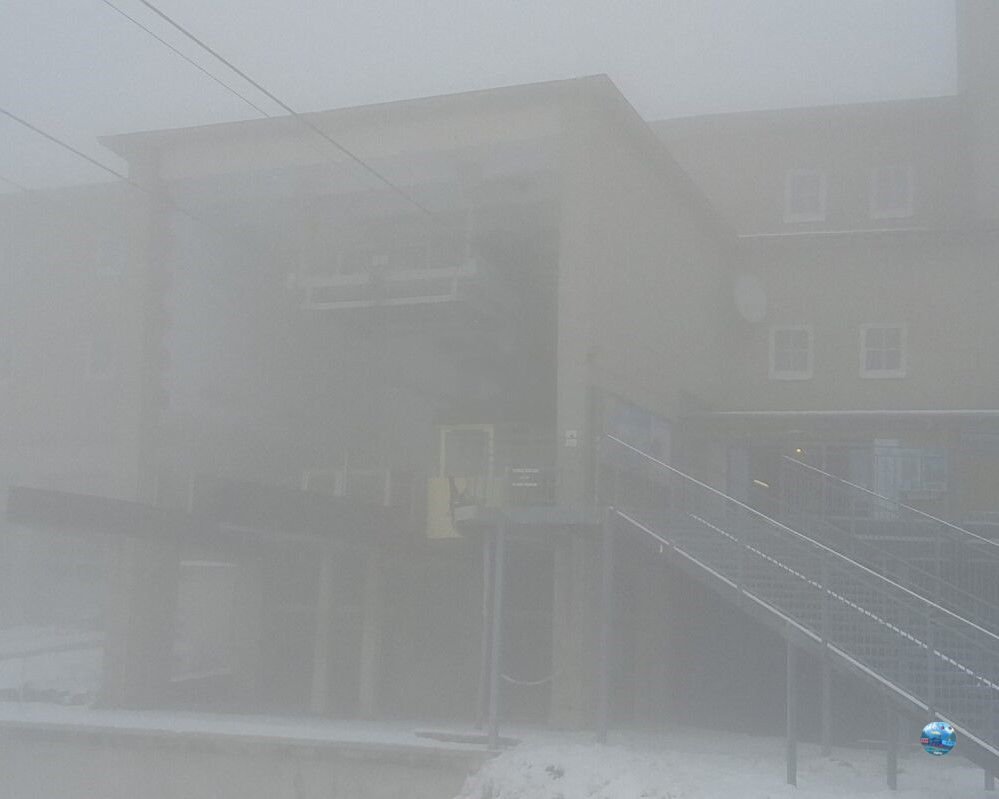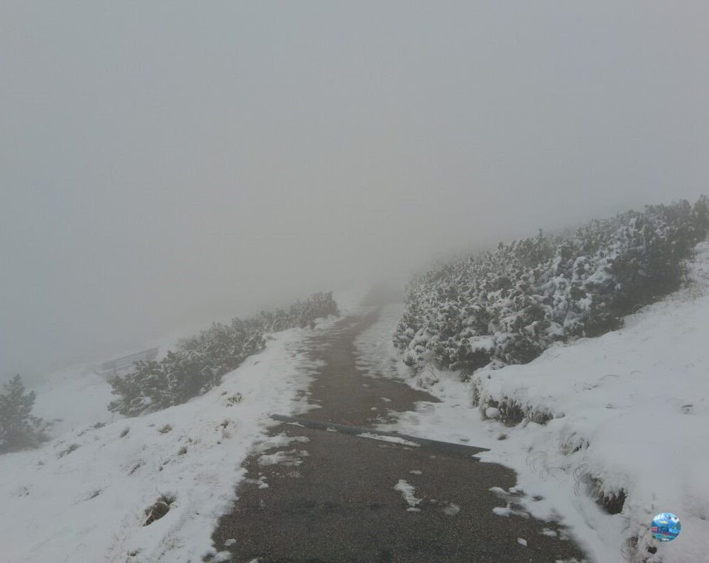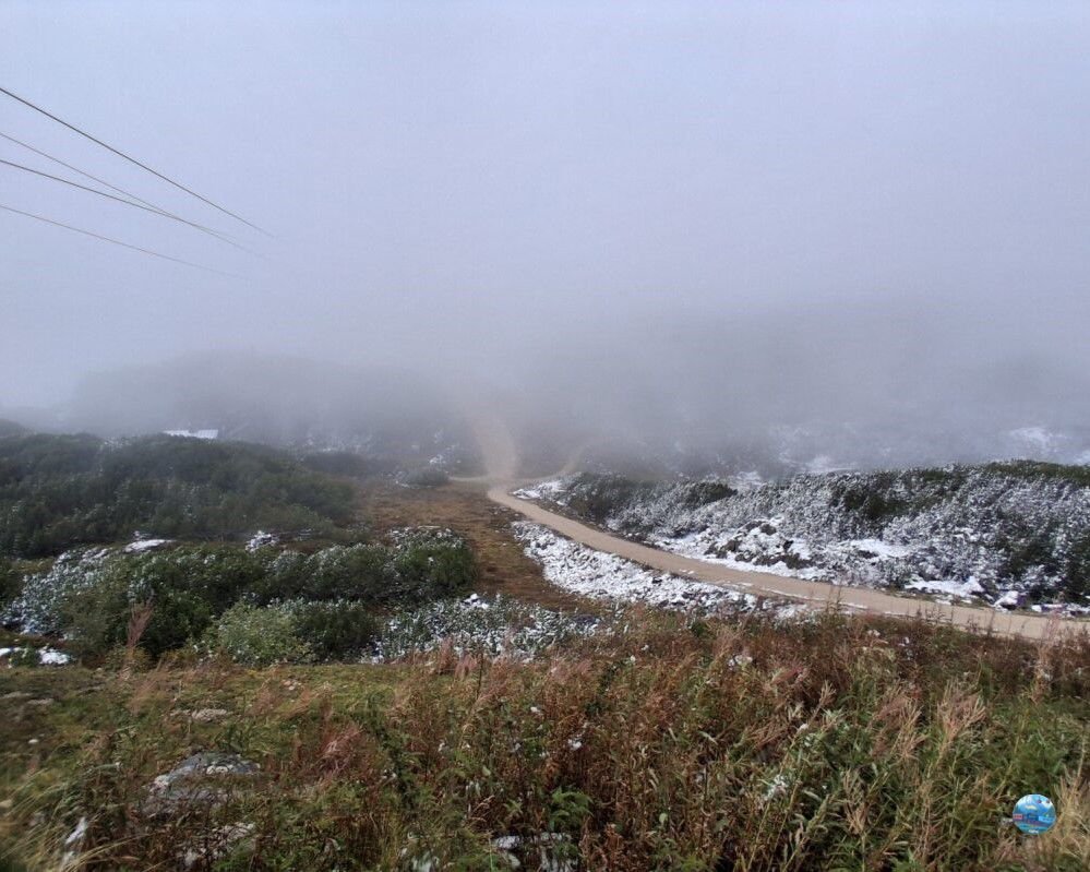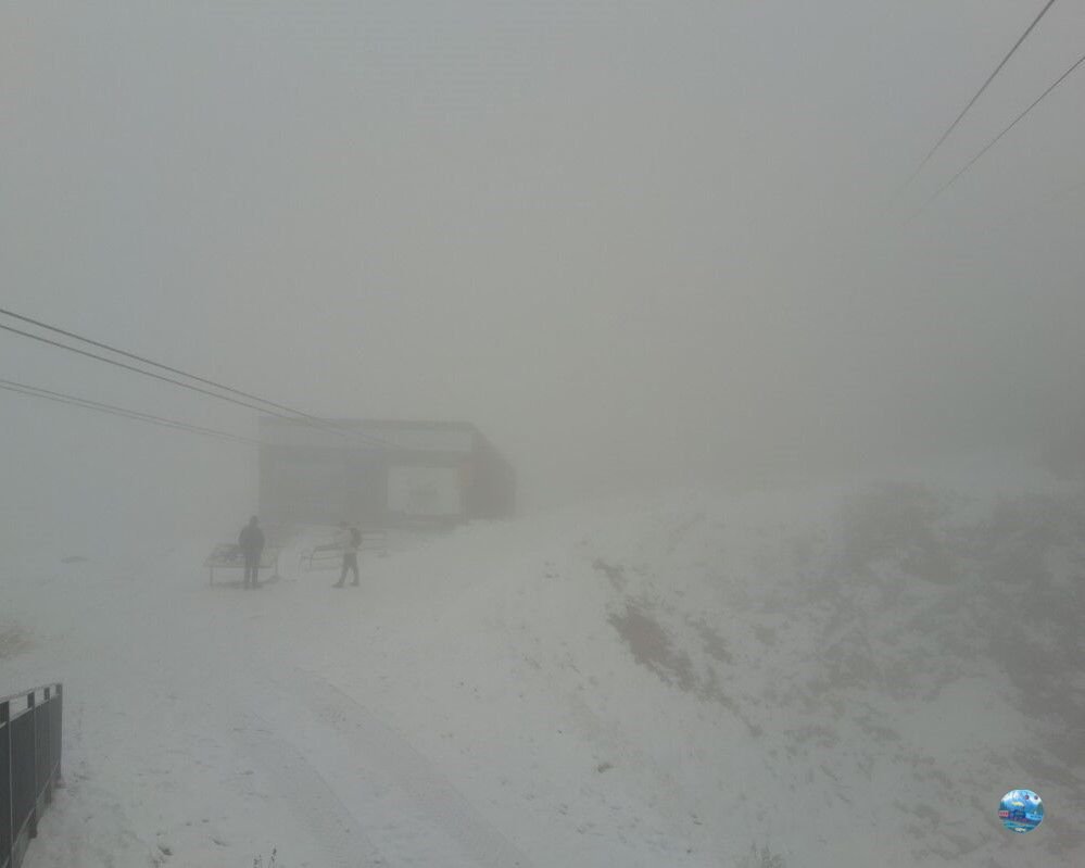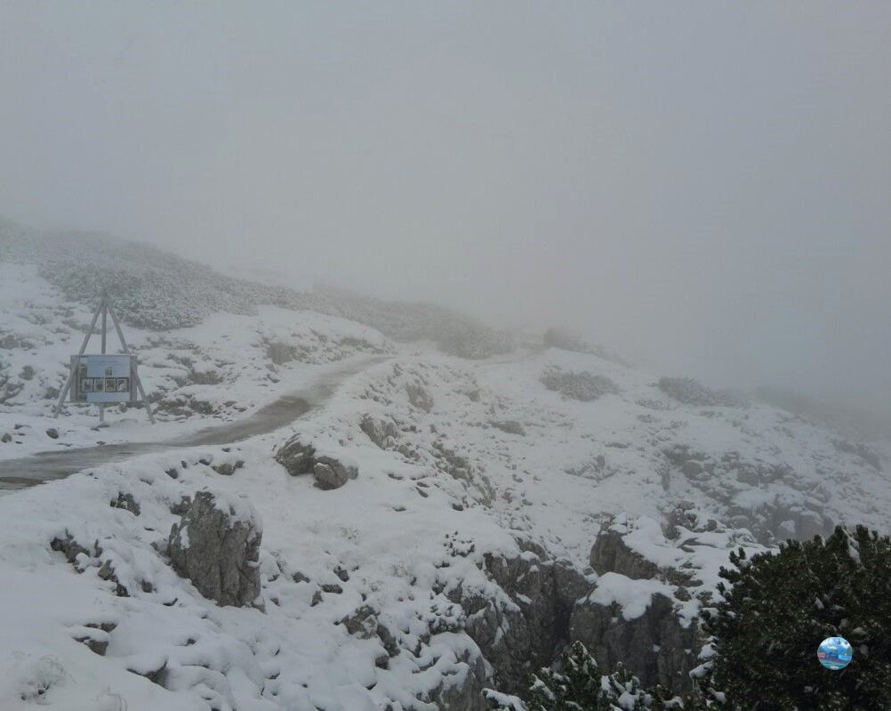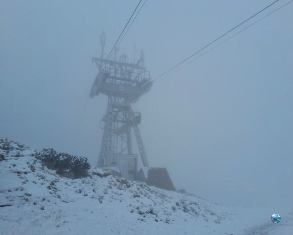 A felvonóból kilépve szakadó hóesésbe csöppentem, amit továbbra is sűrű köd kísért. A látótávolság néhány méterre csökkent, a sziklák és kilátók szinte eltűntek a fehér fátyolban. A szél metsző volt, a hőmérséklet fagypont alatt – a tél itt már teljes erővel jelen volt.